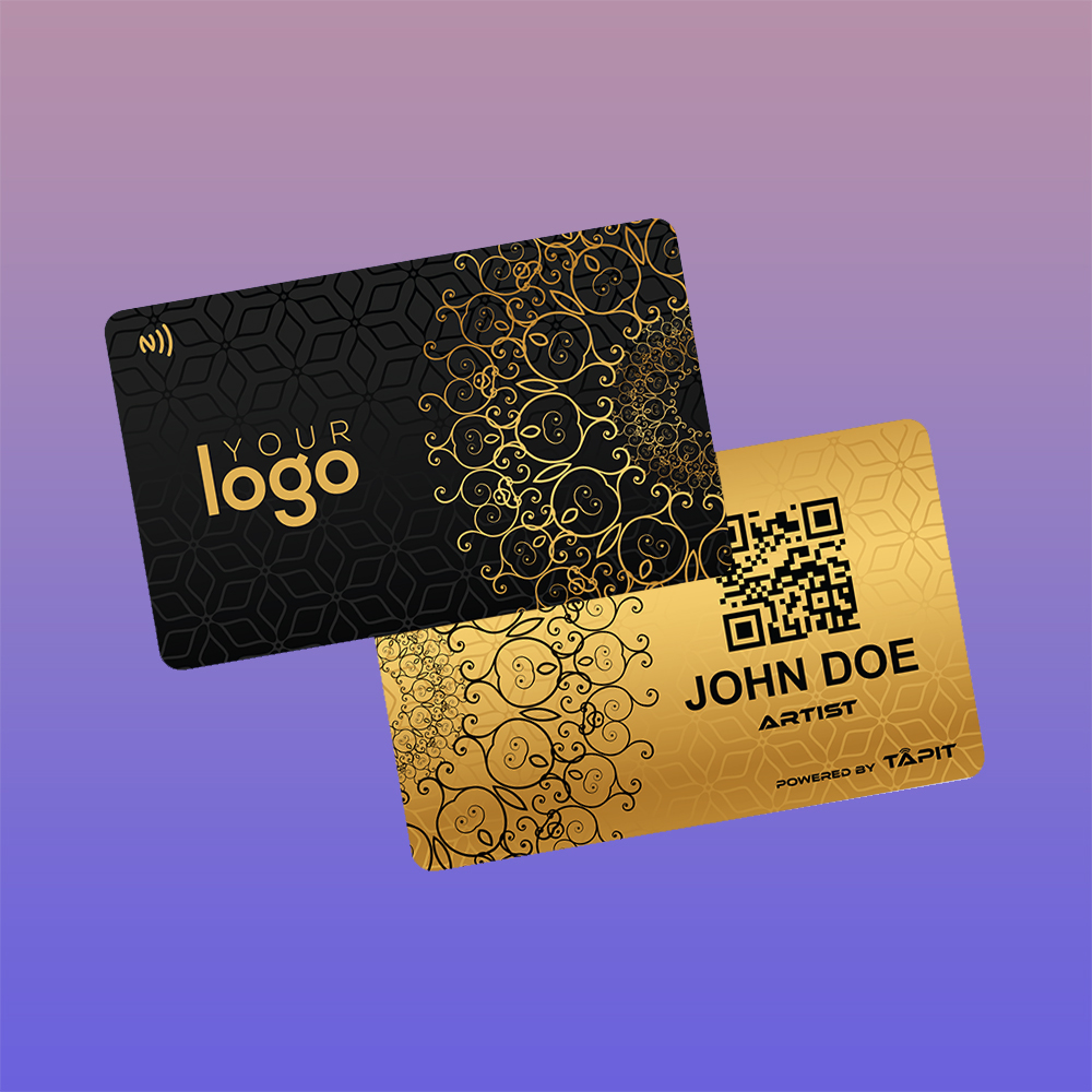 Presenting our NFC Business Card, crafted with premium PVC quality to ensure durability and reliability. The front boasts a sleek black color, while the back features a stunning golden gradient with a circular mandala design. Both sides showcase the mandala design with inverted colors, creating a captivating visual contrast.