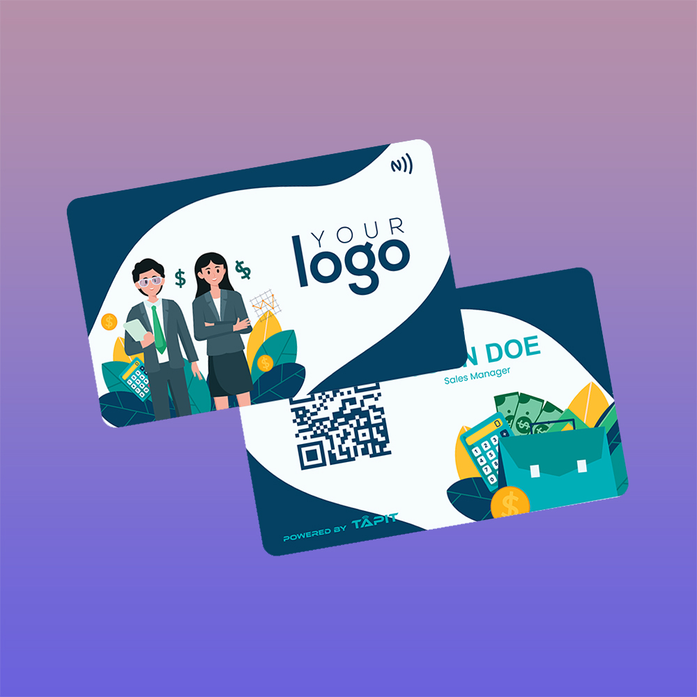 Our Finance Card, tailored for finance professionals, features a sophisticated Prussian blue color and is crafted with PVC quality. The back of the card showcases a professional bag and money, symbolizing the finance industry.